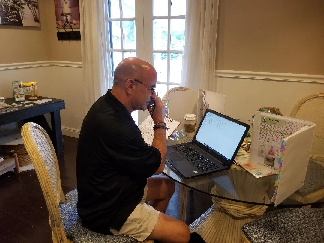 I get to the venue about 3 hours prior to ceremony time, if not sooner, and start the set up process. The event itself is the easy part because we are so well prepared by that time. The event goes off without a hitch and it's time to pack everything up which sometimes takes a bit longer than set up because first of all we are all a little tired after your great event, but if you were outside, on the beach, or anywhere else that isn't enclosed, I need to wipe down the equipment to get all the dust, dirt, or sand that got over everything during the evening. Then it's back to the warehouse, unload, and get a good nights sleep. When we wake up, it's time to do it all again.